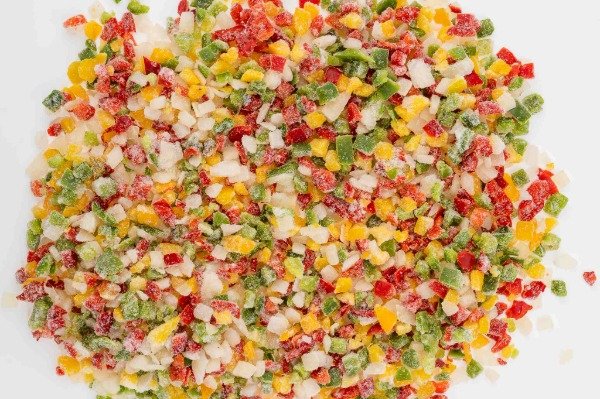 Mezcla de cubos de pimientos rojos, verdes y amarillos con cubos de cebolla congelados I.Q.F. Una explosión de colores para tus tacos o para acompañar tus platos favoritos.