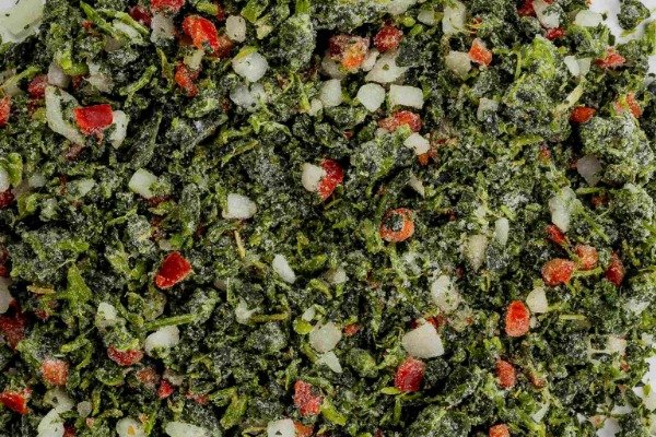 Una mezcla de hojas de espinaca con cubos de pimiento rojo y cubos de cebolla. La manera más fácil, saludable y rápida de hacer tus tartas de espinaca.