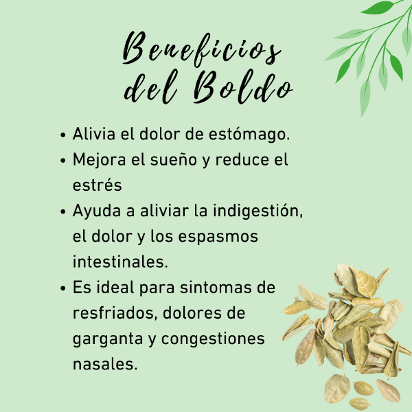 El boldo ayuda a mejorar la digestión, principalmente cuando se toma en forma de té antes de las comidas, sus propiedades digestivas, antiinflamatorias y antiespasmódicas pueden ayudar a aliviar los síntomas de algunas intolerancias alimentarias como mala digestión, cólicos intestinales y producción excesiva de gases.