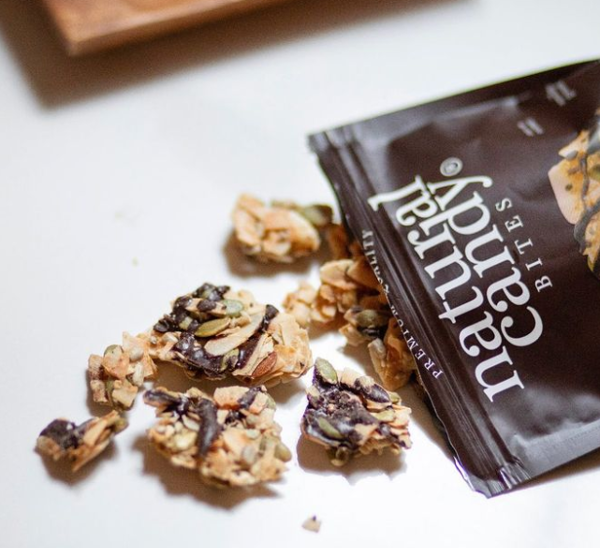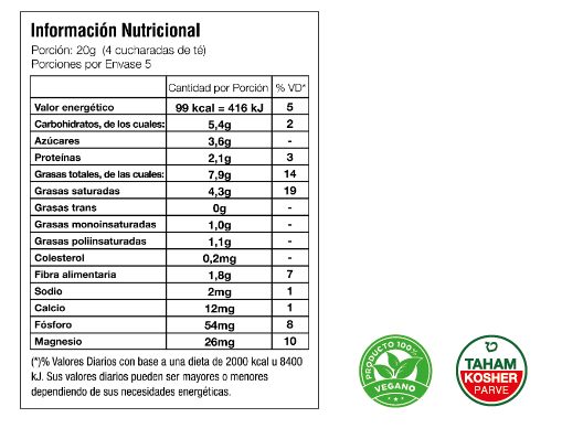 Ingredientes: Coco en escamas, almíbar, semillas de zapallo, chocolate cobertura, semillas de girasol y chía.